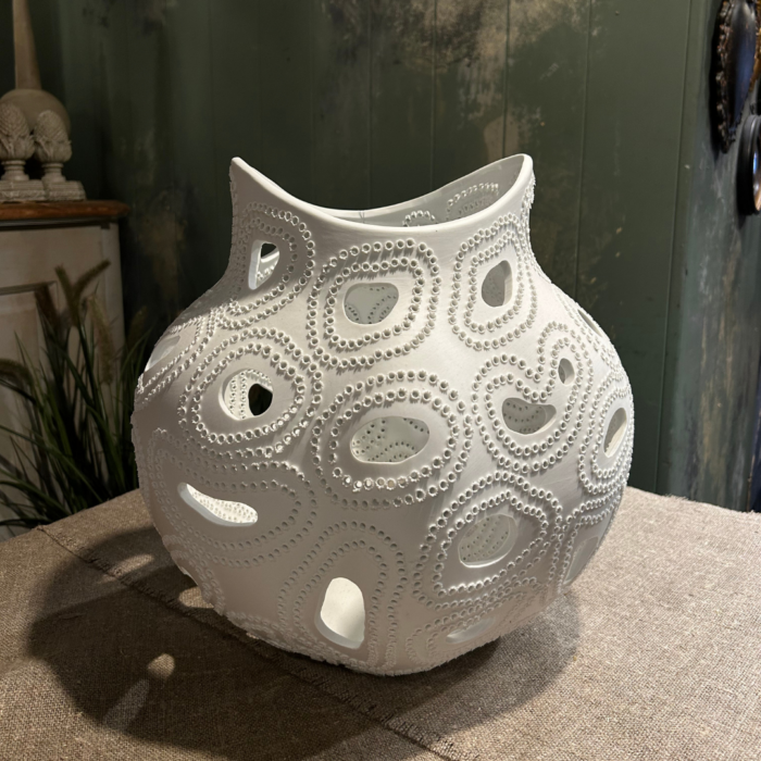 Vaso dal design contemporaneo, caratterizzato da linee ondulate e fori decorativi che creano un elegante gioco di pieni e vuoti. La finitura opaca e la forma scultorea lo rendono un elemento d’arredo raffinato e di forte impatto visivo. Ideale per ambienti moderni, si presta sia come pezzo unico sia in abbinamento con altri complementi.